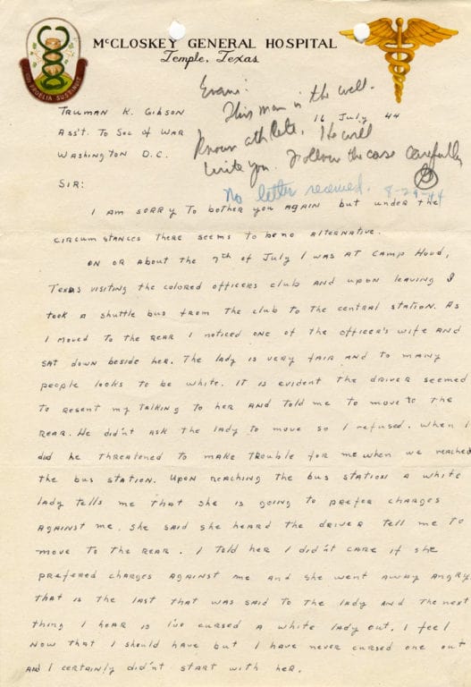 His trial opened on Aug. 2 and ran for 17 days. Bates testified that Robinson was an outstanding officer. Bates even told the military panel that Robinson was traveling on the bus on July 6 at his request. Robinson had reported to a civilian hospital for a medical evaluation to see if he could ship out to Europe with the 761st.