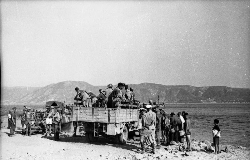German troops and their British prisoners of war wait for the return of a ferry that would take them from Sicily to mainland Italy in August 1943.