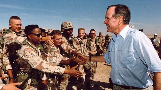 Yet, when Iraqi troops poured across the Kuwaiti border, and the rest of the world told him sanctions would bring Saddam to his knees, it didn’t take the President long to decide to check Saddam Hussein’s aggression. He moved so many troops to Saudi Arabia to prevent an Iraqi invasion that an offensive move seemed imminent. In 1991, Desert Shield switched to Desert Storm and expelled the Iraqis from Kuwait in some 40 days. Not only were the United States and its allies victorious, but the looming shadow of military failure in Vietnam was also broken.