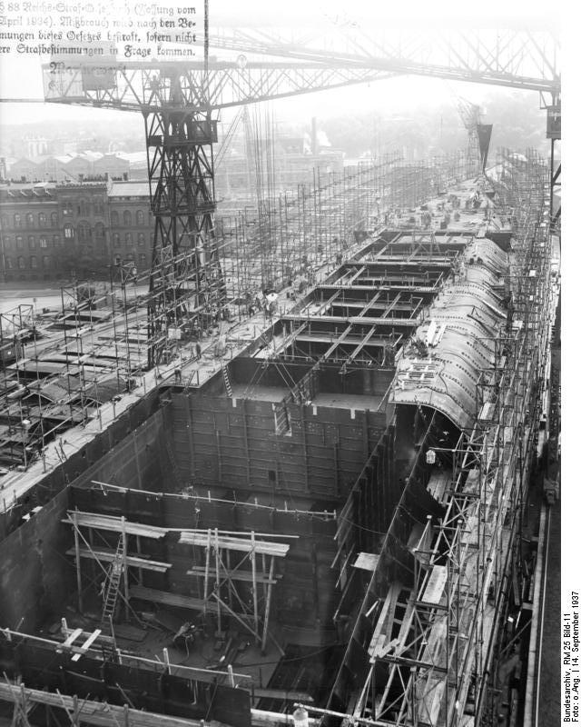Graf Zeppelin was the lead ship in her class of the same name. In 1935, Hitler announced the creation of the Graf Zeppelin-class carriers. That same year, German officials visited Japan to acquire flight deck equipment blueprints and inspect the carrier Akagi. On December 28, 1936, Graf Zeppelin‘s keel was laid down and construction began at the Deutsche Werke shipyard in Kiel, Germany.