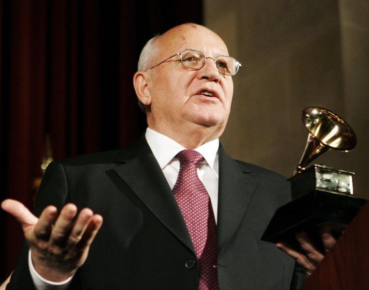 Gorbachev with a decadent Western awards statue, likely sad he missed the chance to meet Christina Aguilera.
