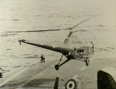 A company-owned Sikorsky S-51 Dragonfly helicopter lands on the USS Princeton during trials with the U.S. Navy.