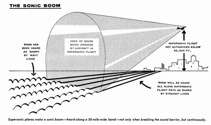 Following Chuck Yeager’s breaking of the sound barrier in 1947, the jet age evolved into the supersonic age. Military aircraft could fly faster than the speed of sound and the race was on to build a commercial aircraft with the same capability. However, America’s supersonic transport development had to take into account the possible effects of constant sonic booms over metropolitan areas from transcontinental supersonic flights.