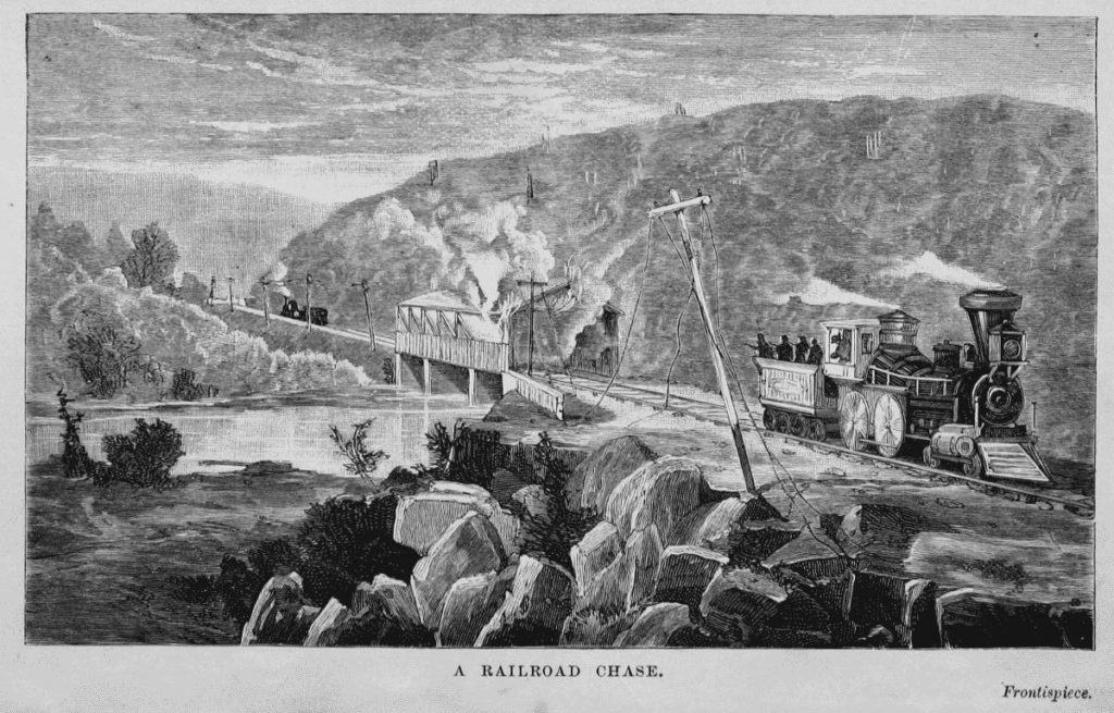 Although slowed by a missing rail, the General‘s engineer, William Fuller, was still in hot pursuit on a handcart when he came upon the Yonah. He commandeered it and continued the chase.