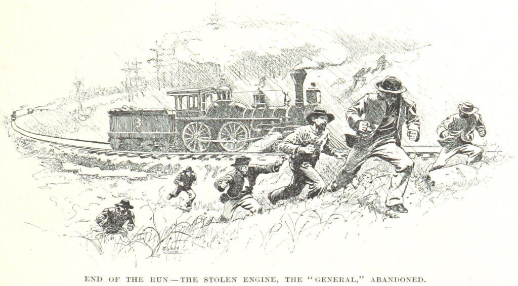 As the train pulled away, The General‘s engineer and two other men ran after the train for two miles before commandeering a handcart and following the train on the rails.