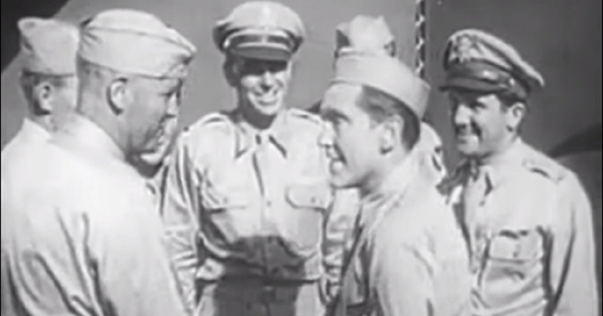 Things will come to a head when the B-24 is sent after a Japanese carrier. You’ll need to watch the film to see how it turns out. But you can see an icon of `60s TV and a future President team up to train tail gunners below.