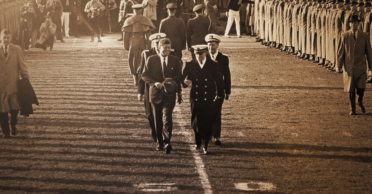 President John F. Kennedy crosses the field at the 1961 Army-Navy Game. (National Archives)