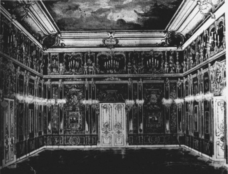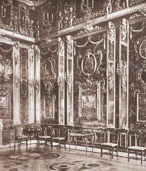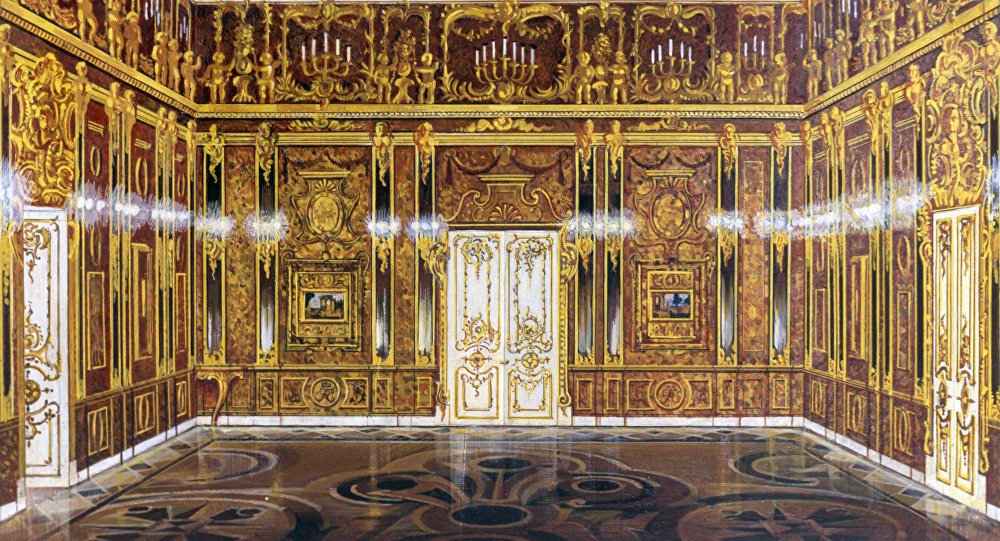 Inside the crates, was an all-amber room that was built by Prussia’s Frederick I between 1701-1706 and later given by Frederick’s son, Frederick William I, to Peter the Great of Russia. The chamber, when assembled, was completely enclosed with amber panels backed with gold leaf and mirrors and garnished with mosaics, nymphs, cupids and angels, inlays, landscapes, and miniatures — all in amber.