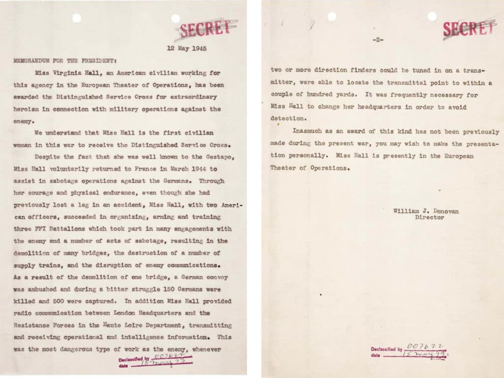 As the war in Europe wound to a close, Gen. Bill Donovan, head of the OSS approved the award of a Distinguished Service Cross to Hall and suggested to President Harry Truman that he pin it on her personally. Instead, Hall requested that the ceremony be kept private so that she could continue work in the clandestine service.