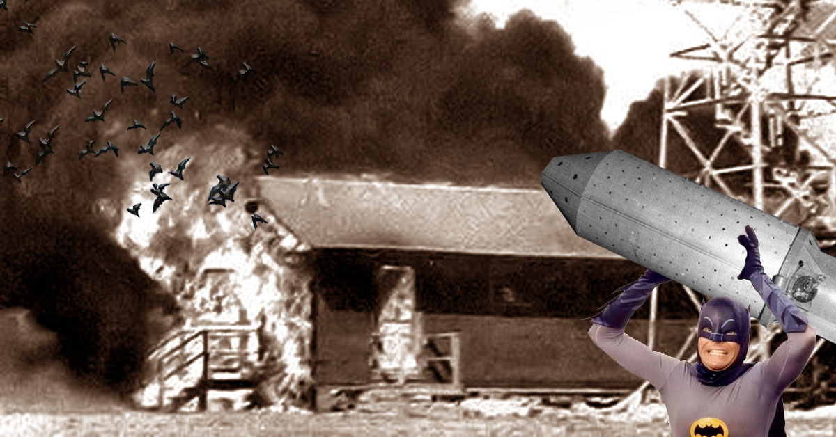 The idea was to strap timer-detonated napalm packets onto the bat, fill a case with around forty bats, drop the bomb over a Japanese village at night, and by the time morning arrived, the bats would detonate the mostly paper and wood buildings.