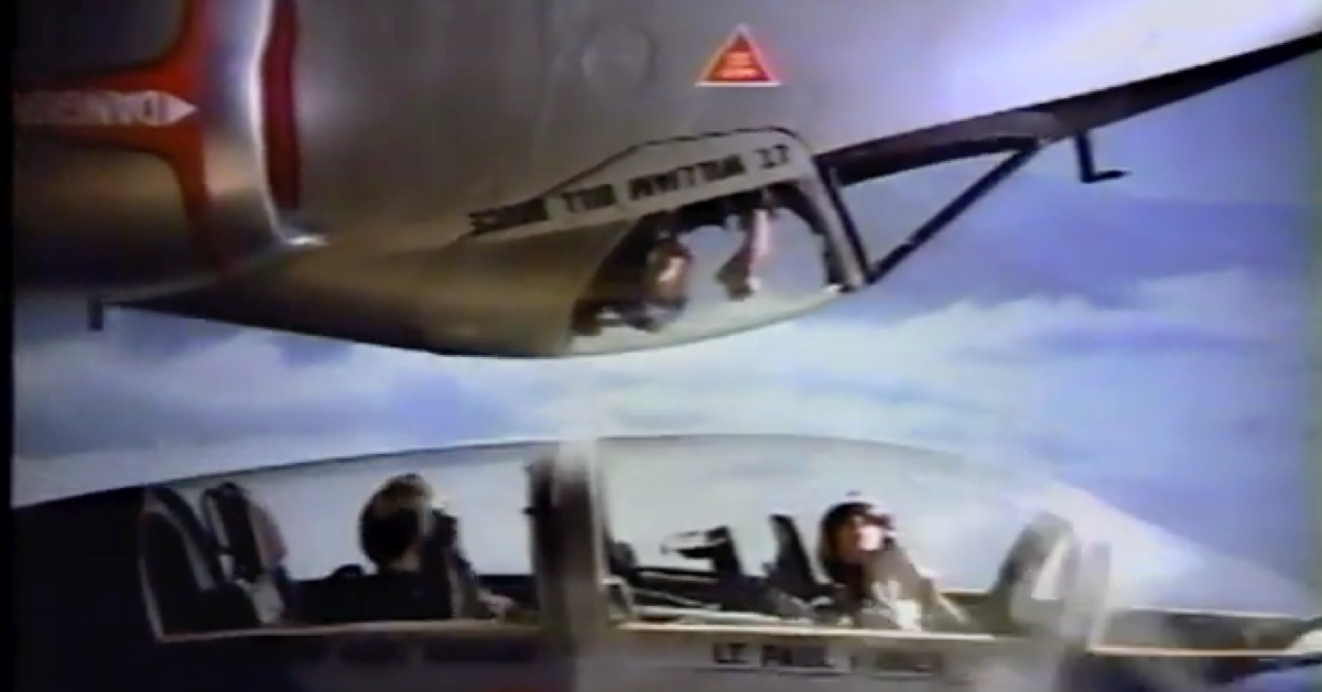 The other pilots jokingly mock him for a few moments, but our “Mustang” Pepsi drinker takes a bottle opener and removes the cap. He then rolls the plane into an inverted position just like Maverick and Goose did at the beginning of “Top Gun.”