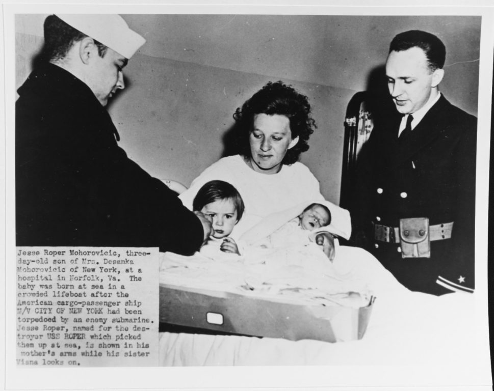 On March 31, 1942, USS Roper rescued 70 survivors, including this mother and child. (US Navy photo)