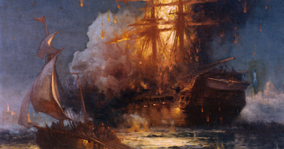 Decatur had hoped to sail the Philadelphia out of the harbor after he had taken her but quickly realized that’d be impossible because of her condition. He also realized the smaller Intrepid would not be able to tow the Philadelphia. To keep the ship from being used against American vessels, there was only one alternative and his orders had been clear: If he couldn’t bring her out of the harbor, he was to burn her.