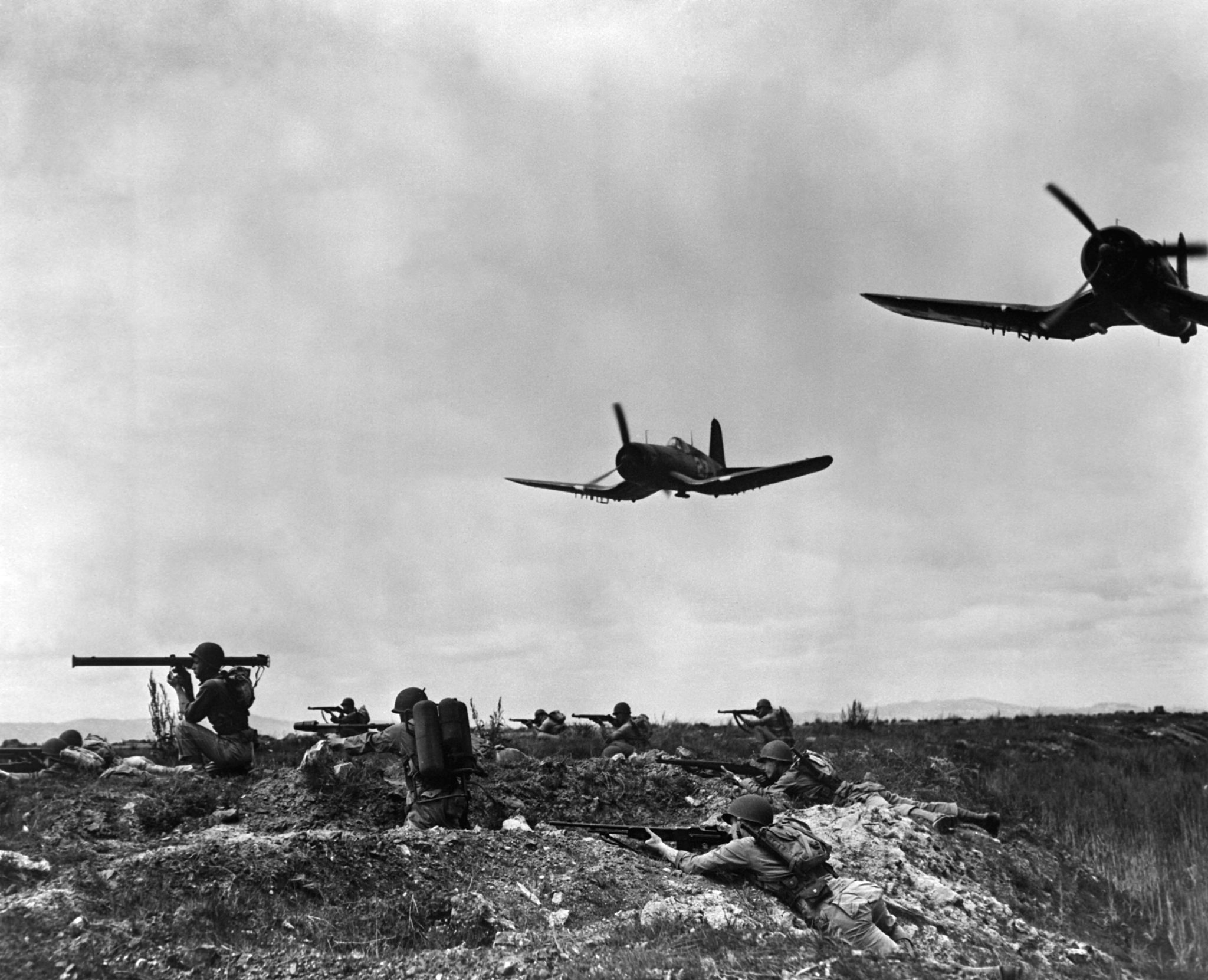 Advancing platoons of Marines, including bazookamen, flamethrowers, automatic riflemen, and sharpshooters find low-flying Marine “Corsair” fighter-bombers flying to their aid. (Photo from Smithsonian)