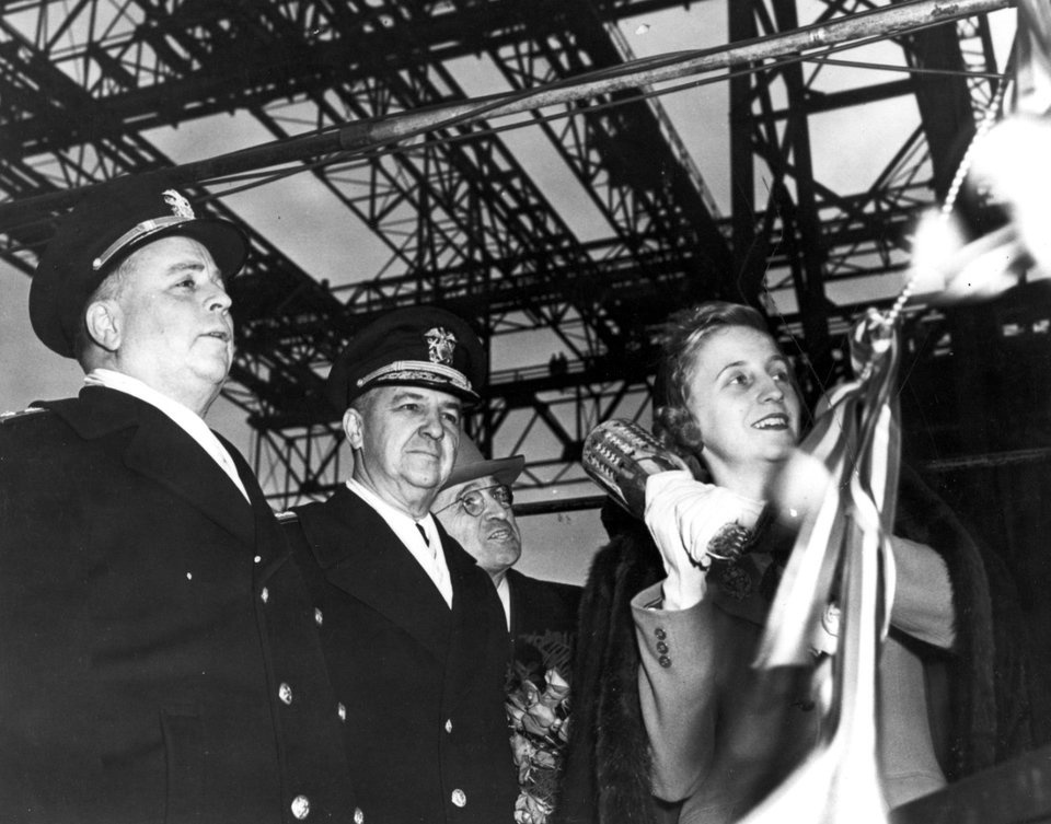 Margaret Truman christens the USS Missouri with then-Sen. Truman in the background at the New York Navy Yard on Jan. 29, 1944.