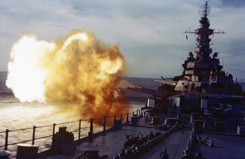 The Mighty Mo fires a salvo of 16-inch shells on Chongjin, North Korea, in an effort to cut enemy communications in October 1950.