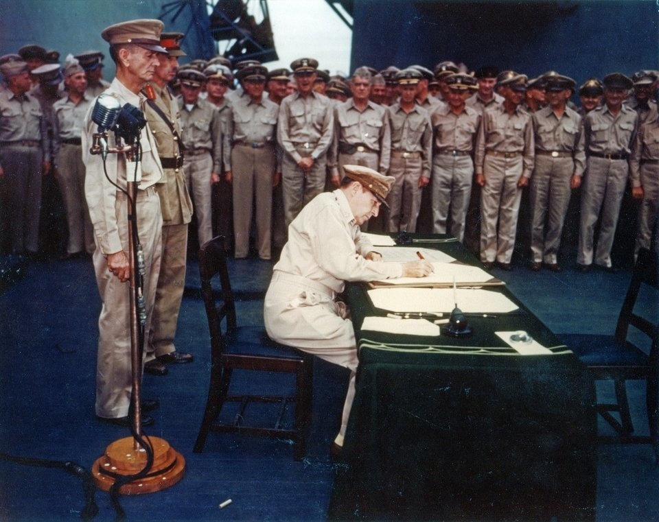 General of the Army Douglas MacArthur signs the Instrument of Surrender on the USS Missouri on Sept. 2, 1945.