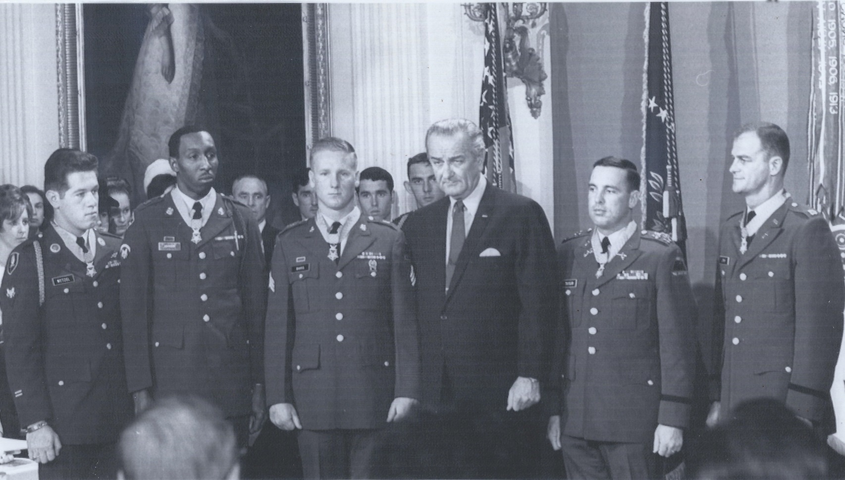 President Lyndon Johnson puts the Medal of Honor around the neck of Sgt. Dwight H. Johnson.