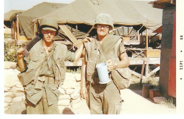 Hospital Corpsman James Kirkpatrick (my handsome dad, on the right) gearing up to head out on patrol in Vietnam, 1968.