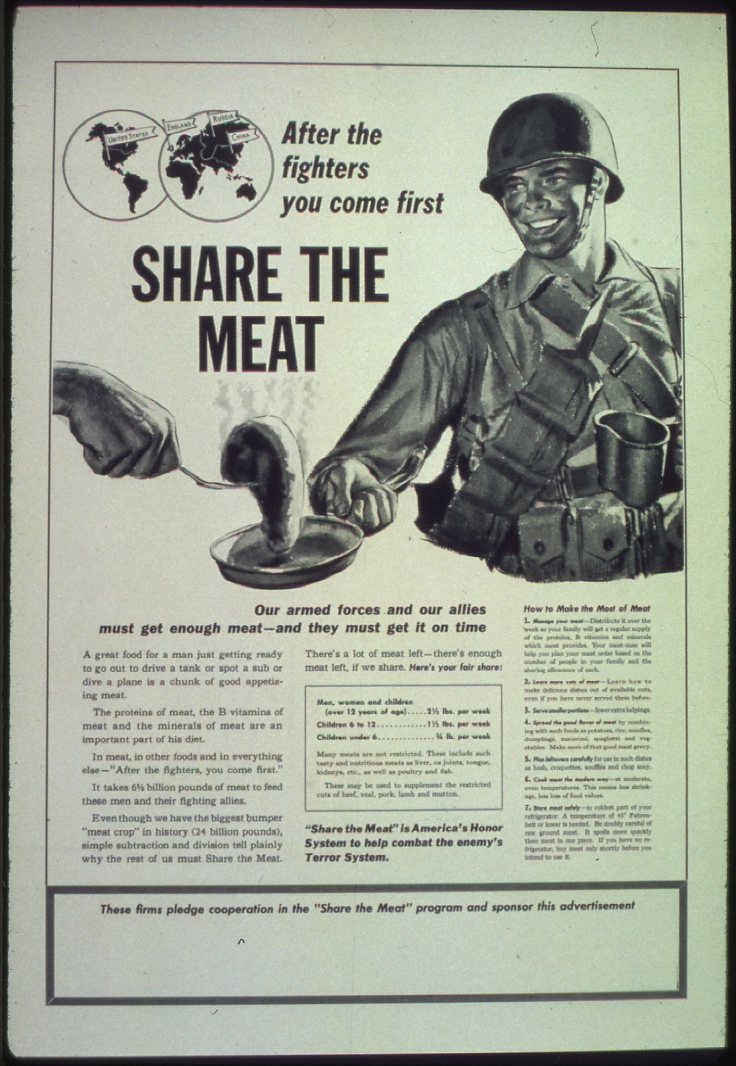 World War 2 propaganda poster shows soldier receiving a massive piece of freshly cooked meat under the slogan “After the fighters, you come first. SHARE THE MEAT.”