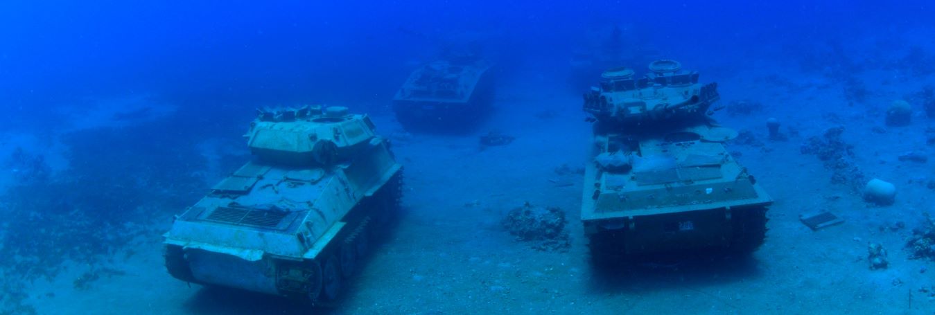 The objects were not sunk as part of a military mission or amphibious landing gone horribly wrong. They were first cleaned of hazard materials and chemicals before being towed out to sea and intentionally sunk as a destination for divers. The exhibits are formed at three different levels, one for each interested party.