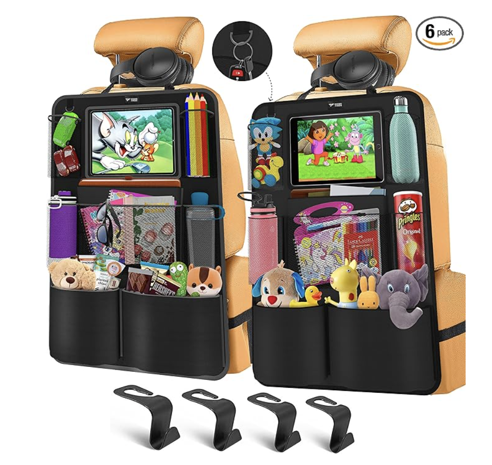 Keep special activity packs, books, electronics and drinks at each child’s seat with an organizer. These strap to the back of each seat and provide kids space to store their road trip essentials so less mess piles up on the floor.