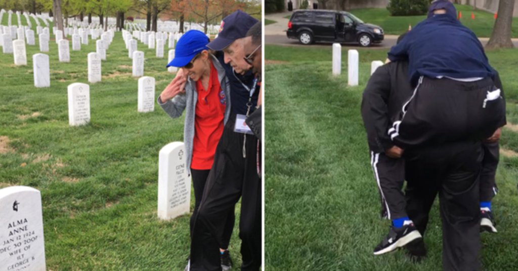 Unfortunately for the North Carolina World War II veteran, in their haste to get to the cemetery, they forgot to bring George Boone’s wheelchair. Where it was isn’t important – he thought he would have to just “see” her from a distance. That’s when an Arlington employee and one volunteer offered to carry Boone to his wife’s grave.
