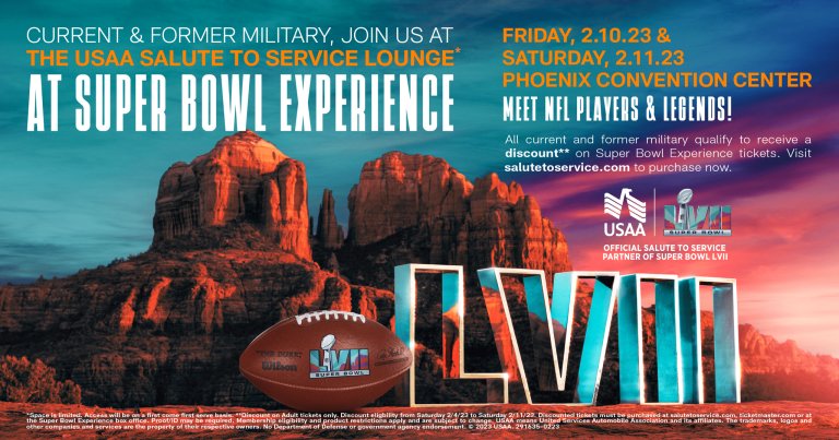 Sponsored by USAA, the 2023 Salute to Service Lounge is the ultimate VIP ticket within the Super Bowl Experience. With exclusive access to coaches, players and NFL legends, the lounge is open to all active duty, veterans, and military family members on-site at the Phoenix Convention Center. NFL greats will offer Q&A sessions, pose for photos and sign autographs in the Lounge. As an added bonus for lounge-goers, the team from We Are The Mighty will be there as well, conducting interviews and doing what we love to do the most: celebrate your service through storytelling.