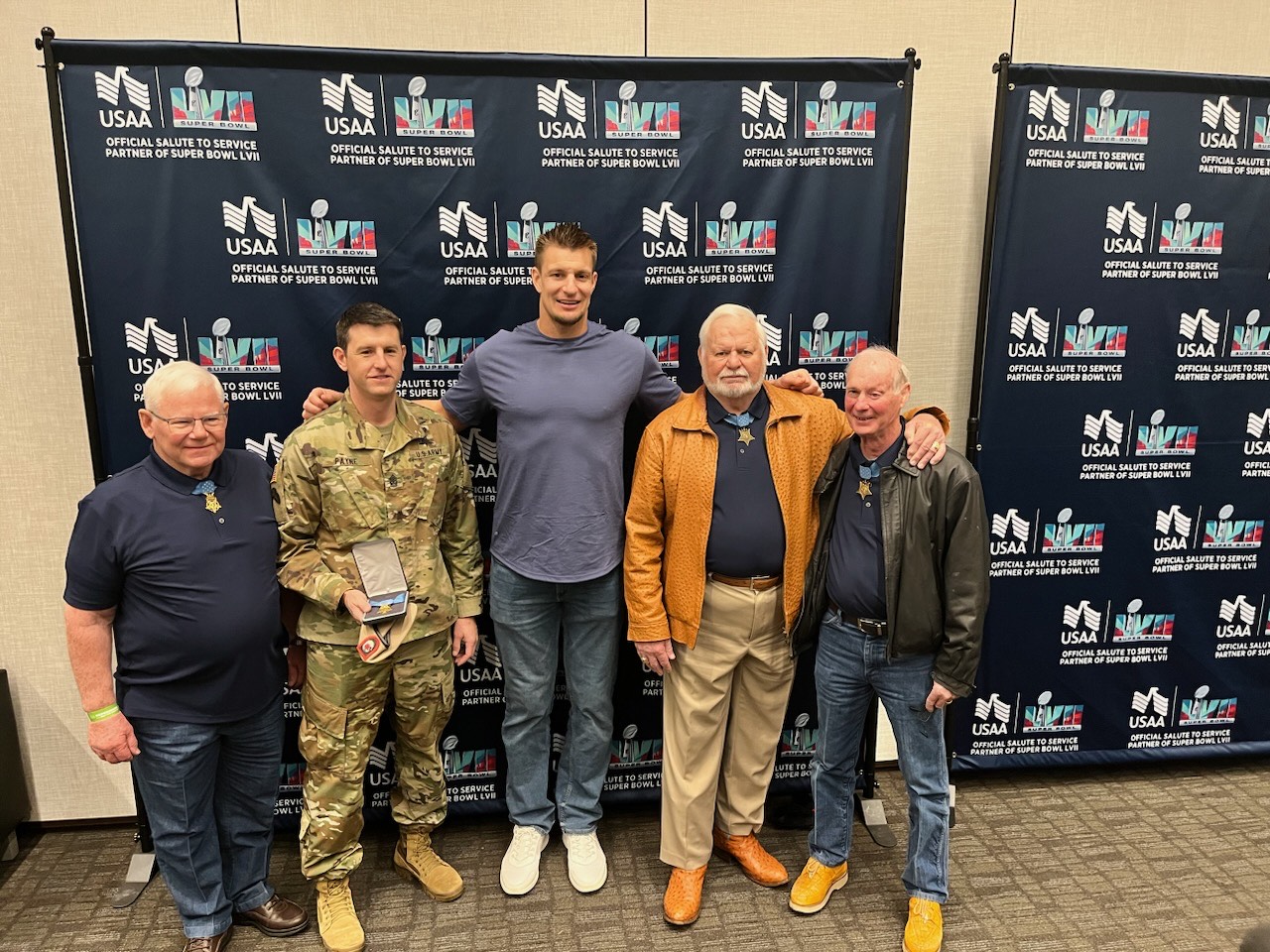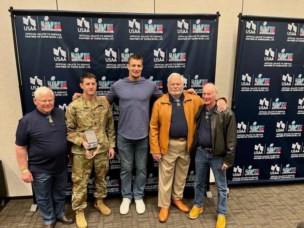 At the USAA Salute to Service Lounge at the Super Bowl experience in Phoenix today, Tampa Bay Buccaneers’ Tight End and USAA commercial star, Rob “Gronk” Gronkowski had a VIP welcome for four incredible heroes and their guests. Gronk took photos, signed autographs, and even did a practice demonstration of tomorrow’s “kick of destiny” for the group, which honored Medal of Honor Recipients Lt. Thomas Norris, SGM Thomas “Pat” Payne, Sergeant Gary Rose and Petty Officer Michael Edwin Thornton.
