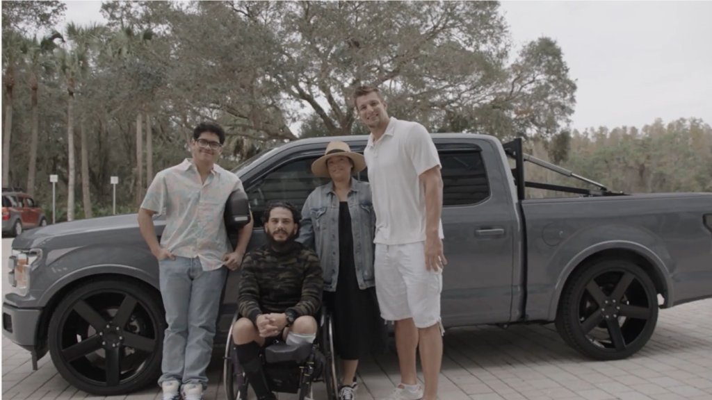 Gronkowski surprised Flores at USAA‘s Crosstown location in Tampa, Florida and handed him the keys to his Recycled Ride. After the Super Bowl champion thanked Flores for his service, the two went to check out Flores’ new ride. “This means a lot to me, to be able to get my independence and get in and out of this [vehicle] with ease,” Flores told Gronkowski. The modified truck also features a mechanical arm in the bed that pivots to the front of the cab to pick up and load Flores’ wheelchair. “That wheelchair thing is something else,” he said of it.