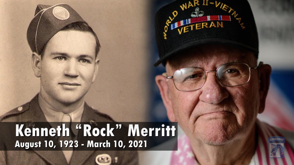 Merritt passed away on March 10, 2021 in his home with his daughter by his side. “We certainly know Rock did his duty here on Earth, not only in WWII and Vietnam, but also in his service to our Soldiers on Fort Bragg,” Fort Bragg and XVIII Airborne Corps said. “For many, his investment in our Soldiers will serve as his legacy. Every change-of-command, every All American Week, every big event, Rock was there. He met every Paratrooper, he shook every Soldier’s hand. He will be deeply missed.”