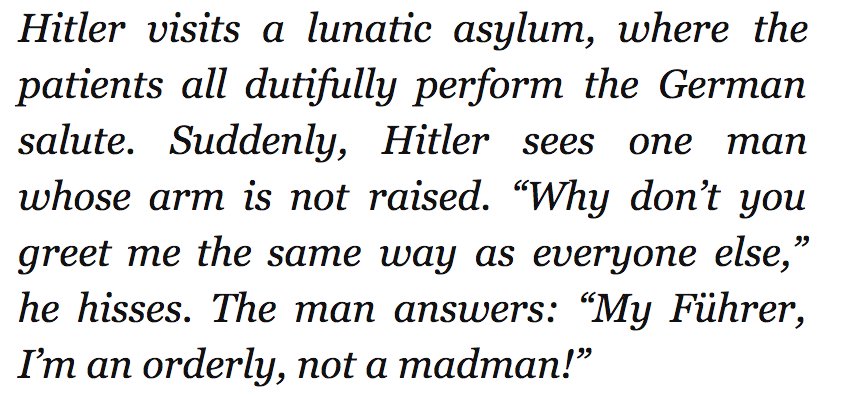 For many Germans, laughing at Hitler within their homes was the most they could do. Far from brainwashed, they were fed up with the laws forcing them to do things against their will. As Rudolph Herzog writes in “Dead Funny: Telling Jokes in Hitler’s Germany,” these jokes could get you in a concentration camp or in front of a firing squad. These are the jokes people living under Hitler and the Third Reich told each other.