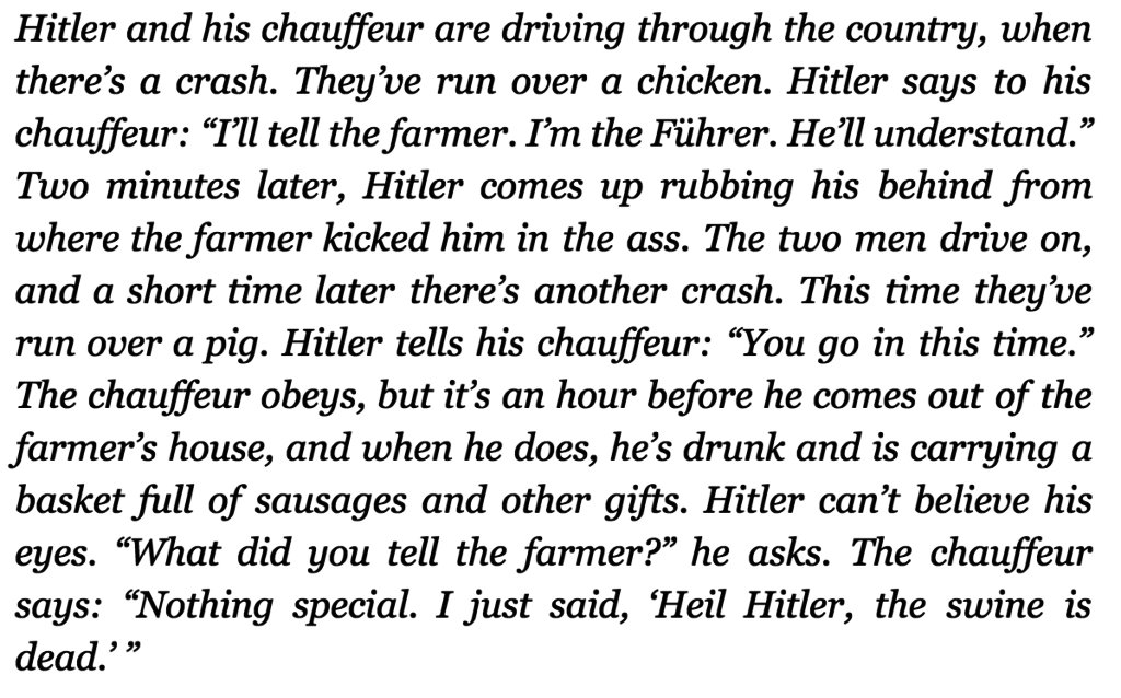So it’s safe to say that not every German was huge supporter of the Nazi party and its leadership. But after a while, criticizing the government became more and more hazardous to one’s health. How does a population who can’t openly object to their government blow off the built-up popular anger among friends? With jokes.