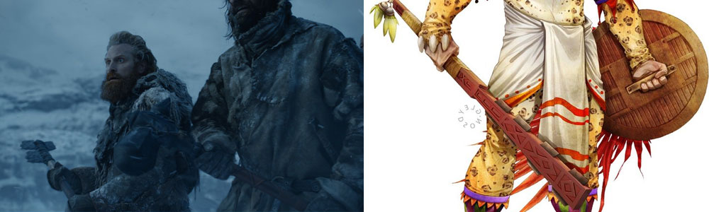 This one blows my mind for not just its similarly primitive design, but also how it was made. It’s never outright stated in the show, but it looks as if his ax is made of Dragonglass — something we know can kill White Walkers and Wights. Dragonglass is also known as obsidian in the show and lore.