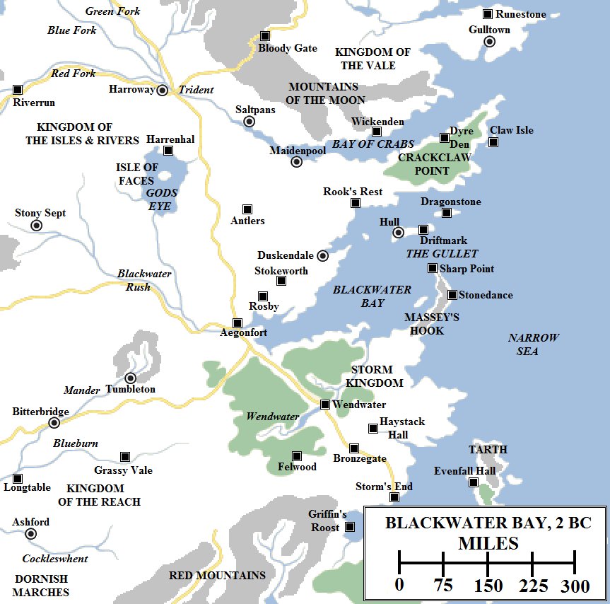 King’s Landing would later be built upon the site of the Aegonfort, but this map shows the distance from there through Blackwater Bay to Dragonstone is estimated at under 500 miles.