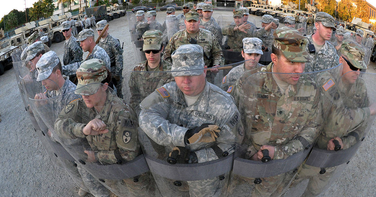 Soldiers from the 1st Battalion, 41st Infantry Regiment, 2nd Infantry Brigade Combat Team take cover behind a riot control vehicle. (U.S. Army photo by: Staff Sgt. Thomas Duval)