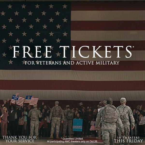 The promotion will be available at all AMC Theatres playing “Thank You for Your Service.” Free tickets will be available on a first-come, first-served basis and may only be picked up at the AMC box office on Oct. 26, 2017.