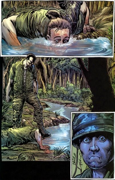 In issue #2, after all of the chaos of battle, Castle finds one of his privates sexually assaulting a wounded female enemy soldier. He puts her out of her misery. While the private was cleaning himself off in a nearby river, Castle drowns him in the water saying that “we’re only here to kill the enemy.”