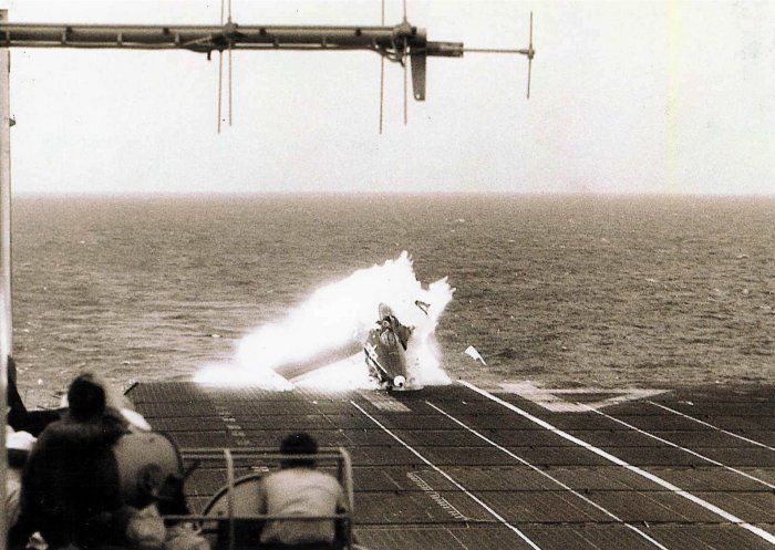 F-9 Cougar hitting the ramp of the USS Midway (CV 41) during the Korean War. For some reason that only Paramount Pictures might be able to explain, the film of this mishap was used to represent an F-14 Tomcat crashing in the movie “The Hunt for Red October.”