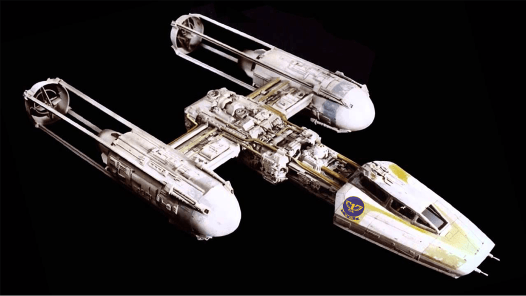 Best known as the fighters flown by the ill-fated Gold Squadron in the first Star Wars movie, the Y-wing was intended as an attack plane – and in the first movie, the Y-wings were torn to bits by Darth Vader’s TIE fighters (with only one surviving the Battle of Yavin). So, Attack Squadron-128, which flew the A-6 Intruder, seems to be appropriate markings for this space fighter.