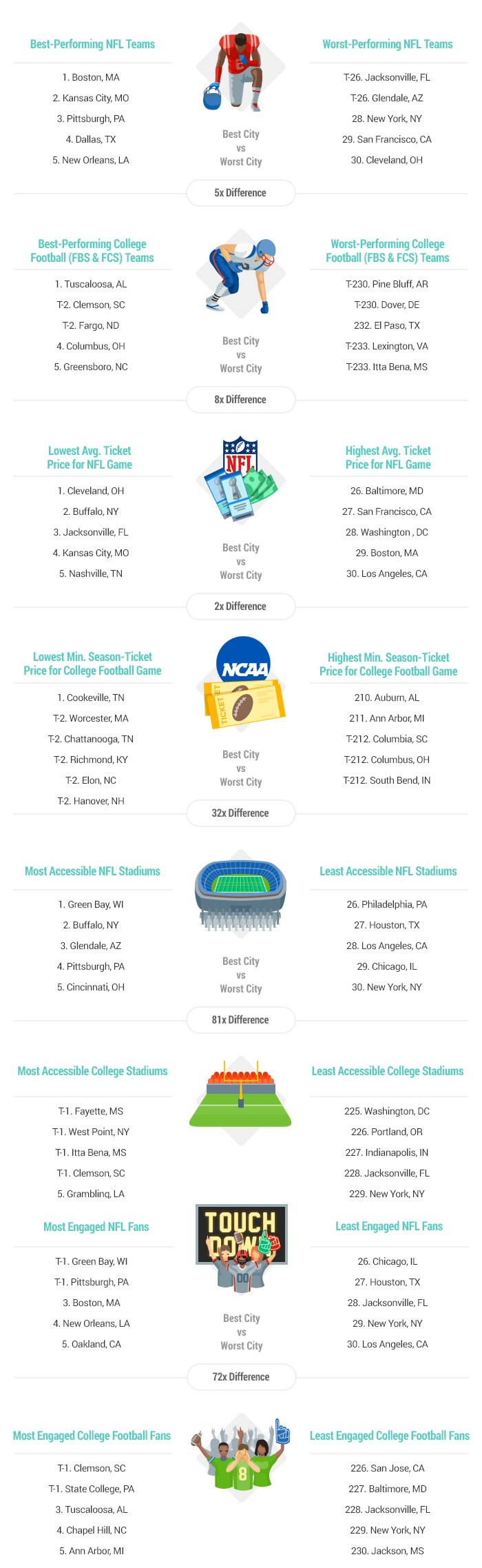 Keep in mind, this isn’t just about NFL football, but you will find familiar NFL franchise cities on the top of the list. It also includes NCAA football. Some 244 American cities were graded on 21 different metrics using a 100-point scale, with 100 being a perfectly favorable score. WalletHub included one professional team or one college team, and assigned weights to each category based on its popularity with fans. The weighted averages comprise the list and are grouped by city size.