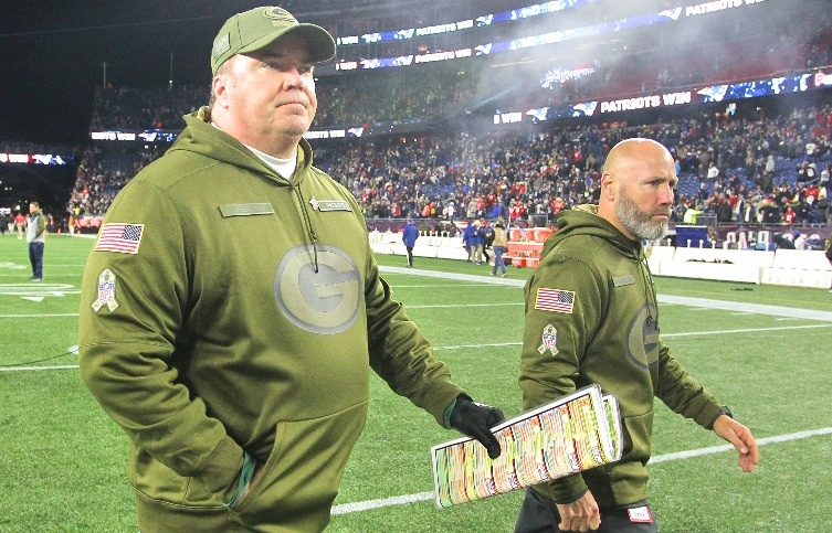 Green Bay Packers coach Mike McCarthy sports the NFL’s 2018 “Salute to Service” hoodie vs. the Patriots on Sunday, Nov. 4, 2018.