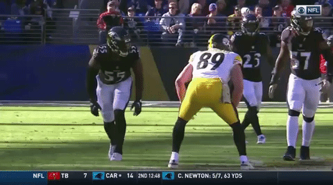 Just for fun, watch Villanueva manhandle legendary Ravens outside linebacker Terrell Suggs, who is 6’3″ and 265 pounds and is number 19 on the all-time QB sack records. Villanueva chops him down like he’s made of balsa wood.