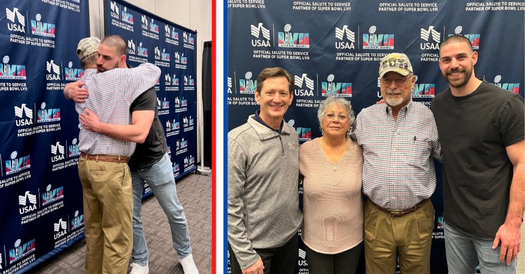 Since 2012, USAA has partnered with the NFL for the Salute to Service initiative. Salute to Service is the NFL’s year-round commitment to Honor, Empower, and Connect with our nation’s service members, veterans, and their families. It is grounded in deep partnerships with military and veteran support organizations. Since 2017, USAA has partnered with NFL players to send veterans to the Super Bowl. USAA CEO Wayne Peacock said, “Eight of our great veterans are going to get to go to the game this year because of these incredible football players. There are so many parallels – commitment, willingness to be about team – it’s about military service and the NFL. It’s really a transition in what hero status is about.”