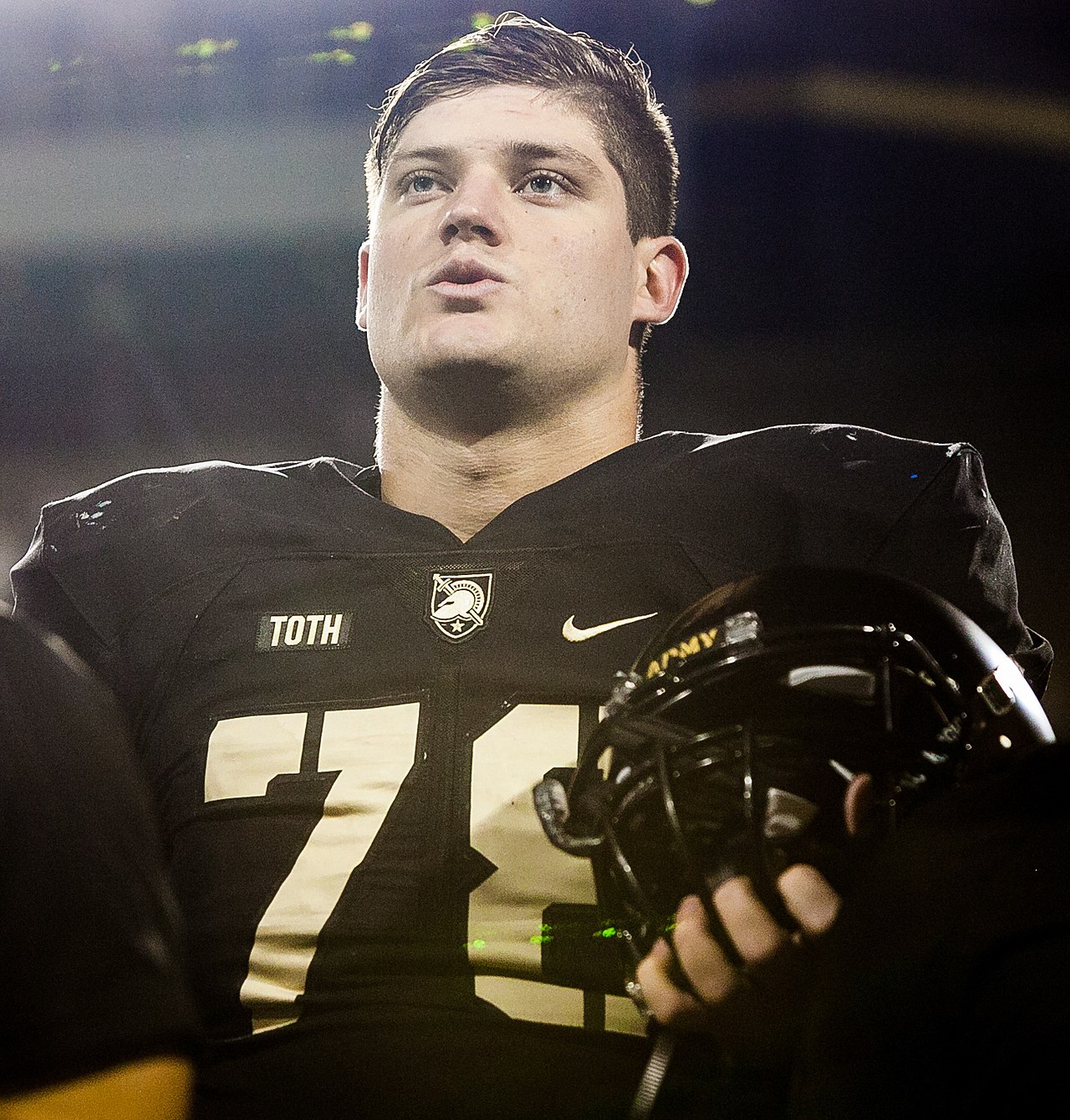 With the Black Knights, Toth was a two-year starter at tackle and had 28 starts in 31 games. Over his final two seasons, he started all 26 games. In 2017, Toth was ranked as the nation’s 5th-best run-blocking tackle by Pro Football Focus. The next year, he became the first Army player to be invited to the Senior Bowl.