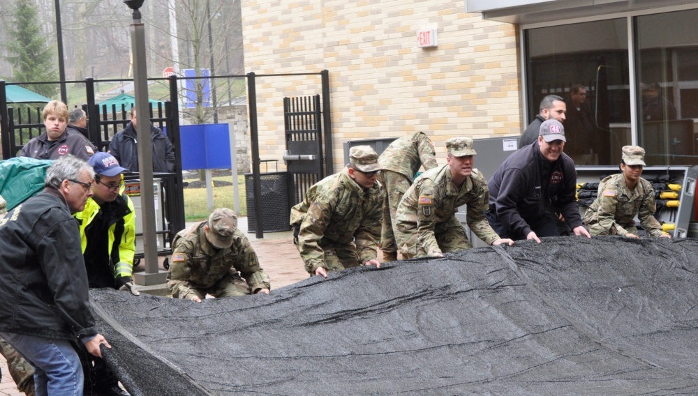 New York Army National Guard Soldiers move a floor during the placement of tents at the New York-Presbyterian-Hudson Valley Hospital in Cortlandt Manor, N.Y., as medical facilities prepare for the response to the outbreak of COVID 19 patients March 20, 2020. The Soldiers are part of the statewide effort to deploy National Guard members in support of local authorities during the pandemic response. U.S. Army National Guard/Richard Goldenberg.