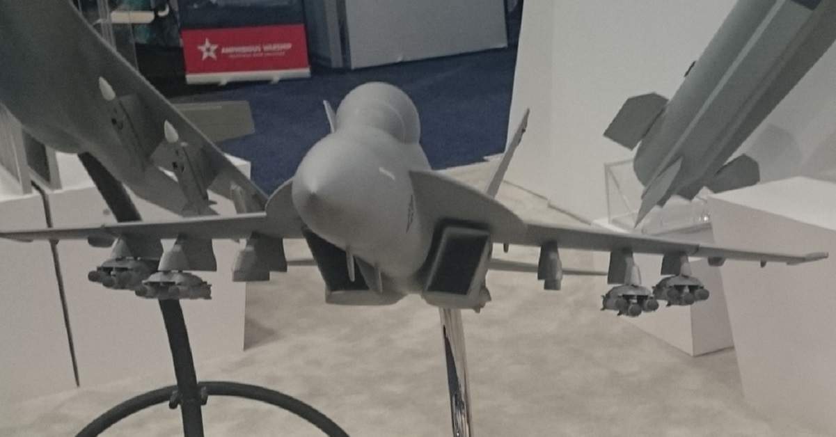But as good as the Hellfire is, there may be a better missile — and the Brits have it. The missile is called Brimstone, and at the SeaAirSpace 2017 Expo, MBDA was displaying mock-ups on its triple mounts.