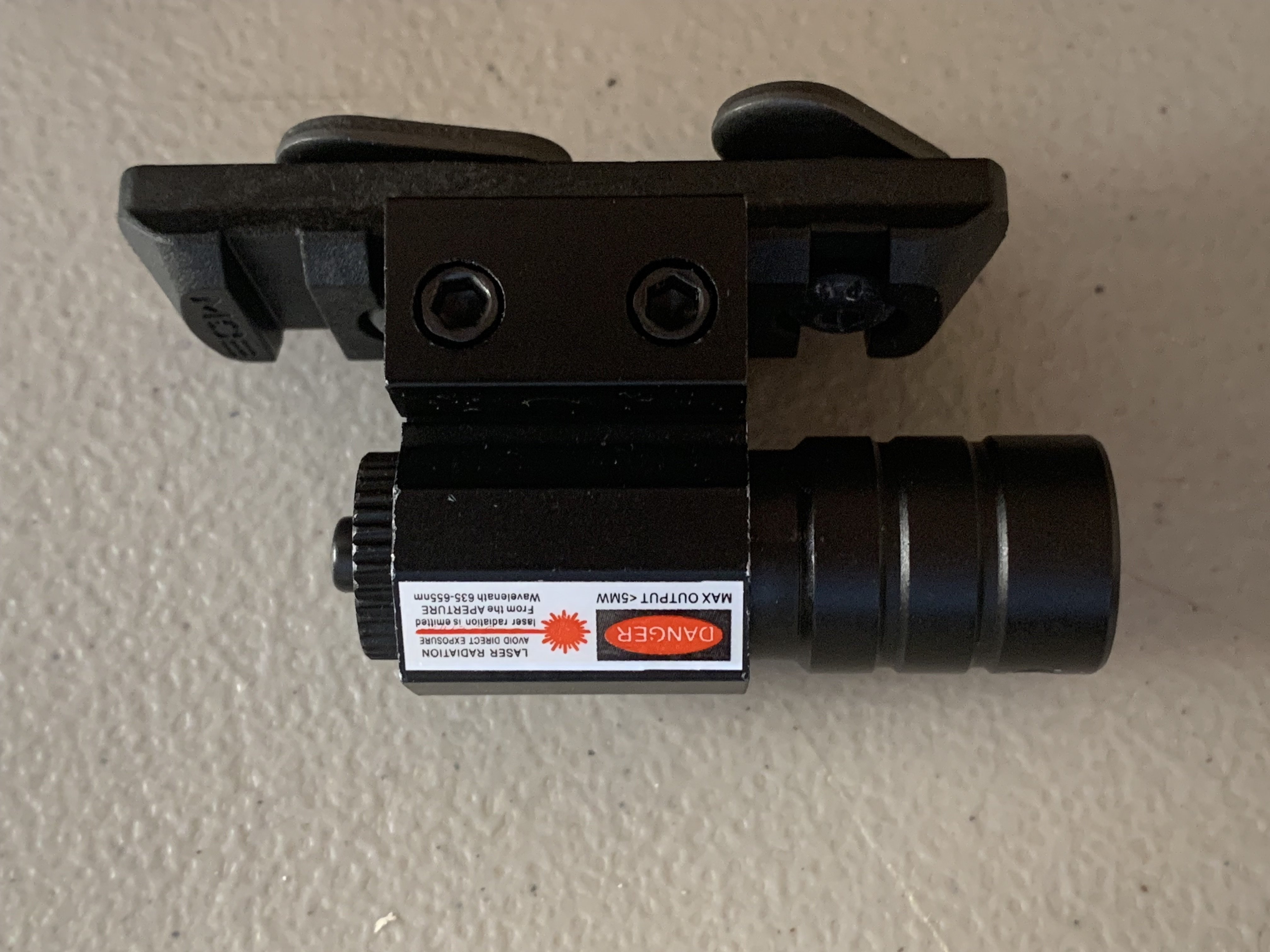 (An odd off-brand, small and very inexpensive visible red dot LASER mounted to a 2.5″ Picatinny segment. A device such as this costs less than .00 w/o rail segment.)