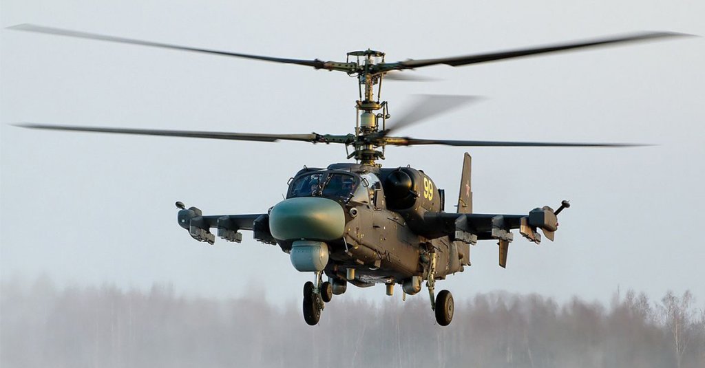 A Ka-52, a derivative of the Ka-50 attack helicopter, flies at Torzhok Air Base in Russia. The helicopter has stacked rotor blades like the Sikorsky SB-1 Defiant, but no pusher propeller like the one that makes the Sikorsky Raider so fast.