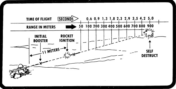 When the projectile is first launched it is powered by a small strip powder charge to reduce the backblast area from harming the gunner. At approximately 11 meters the sustainer rocket kicks in, ignites, and boosts the rocket to maximum velocity.